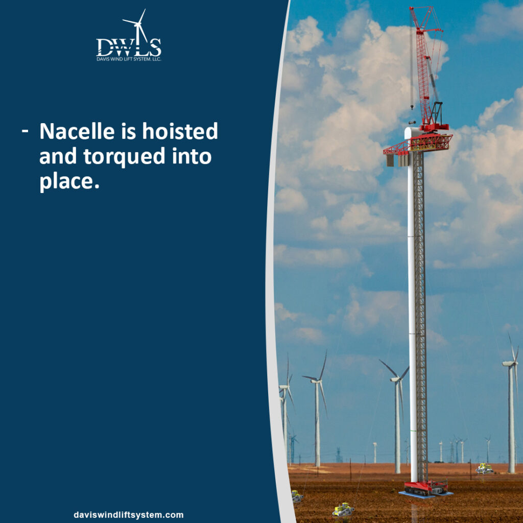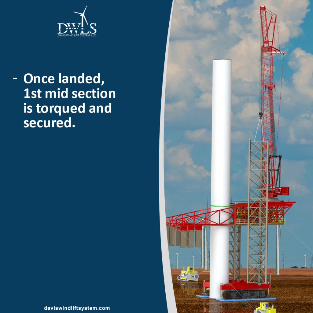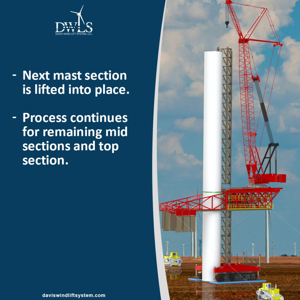 Once ground preparation and the wind tower foundation are complete, a support crane sets the base tower. Then, the Davis Wind Lift System is assembled around the base of the tower on its own portable steel crane pads.